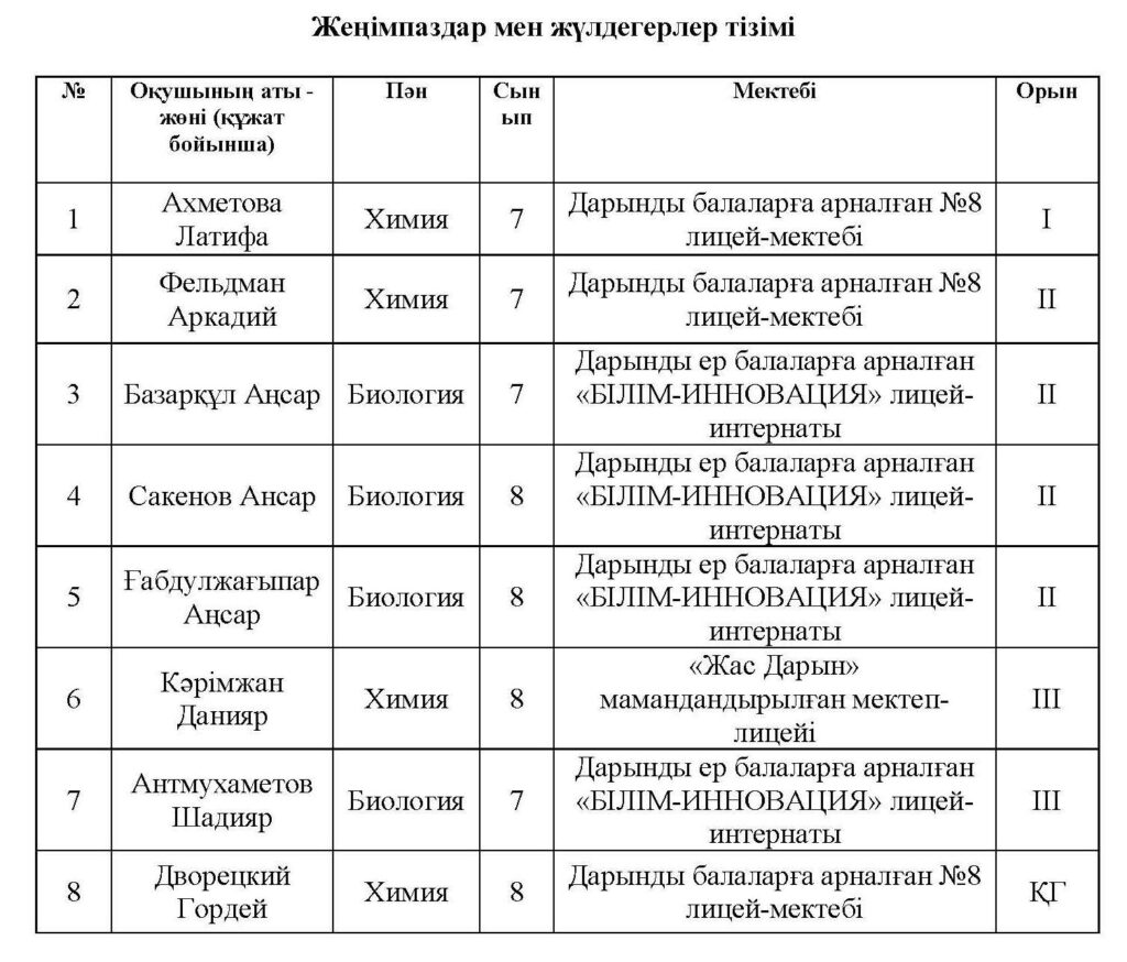 Олимпиада қорытындысы бойынша Павлодар облысының оқушылары 7 медаль жеңіп алды, оның ішінде 1 алтын, 4 күміс және 2 қола. Құрмет грамотамен бір оқушы марапатталды.