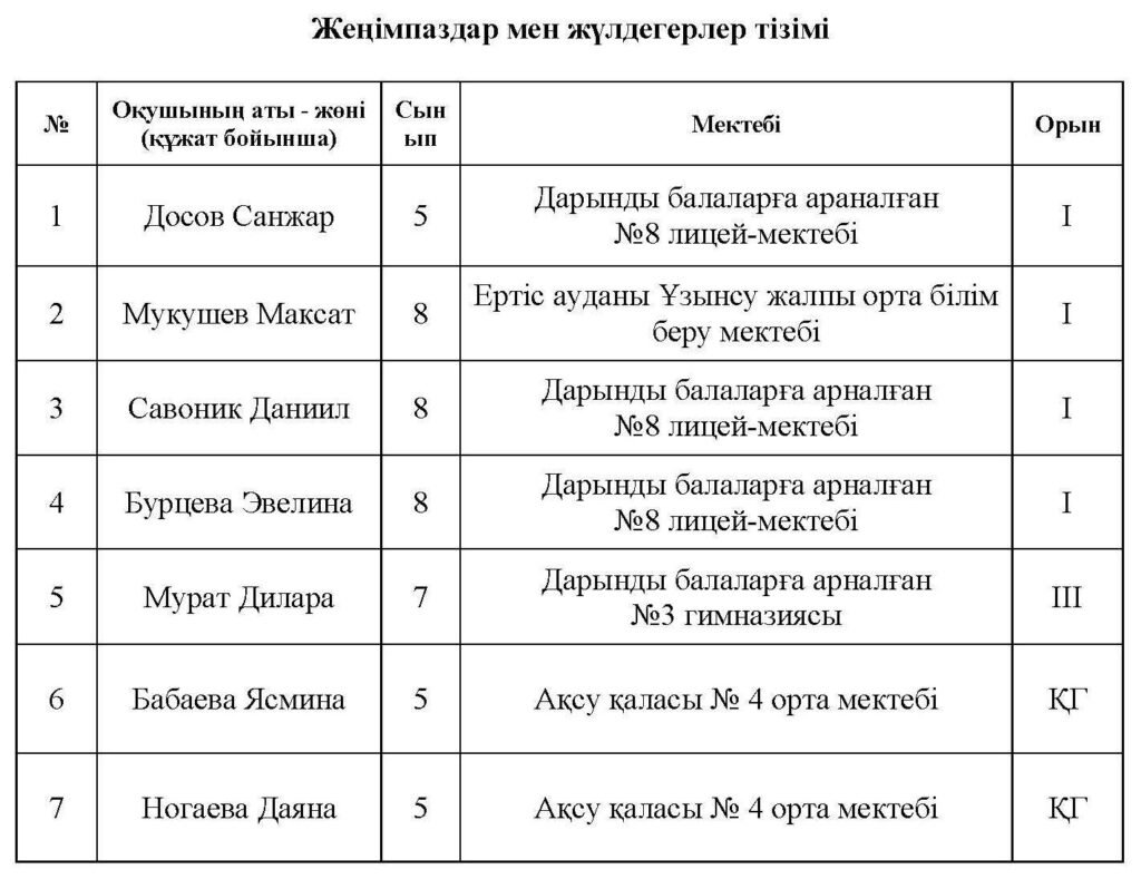 Конкурс қорытындысы бойынша Павлодар облысының оқушылары 5 жүлделі орынға ие болды, оның ішінде І орын – 4 және ІІІ орын – 1. Құрмет грамотамен екі оқушы марапатталды.