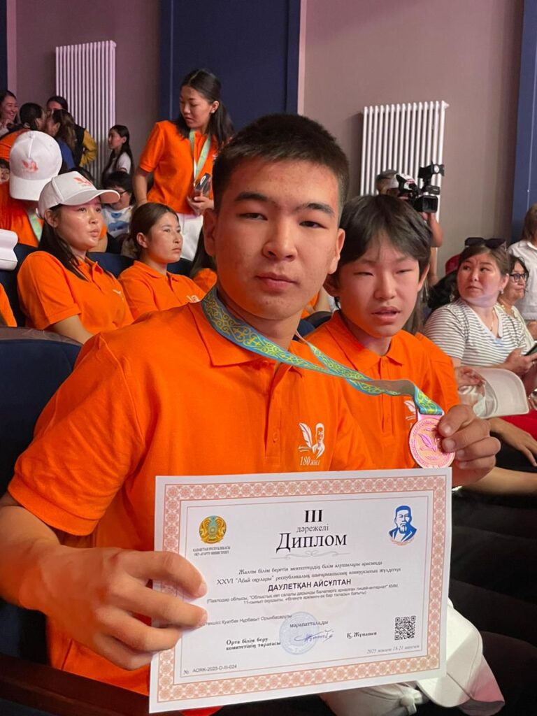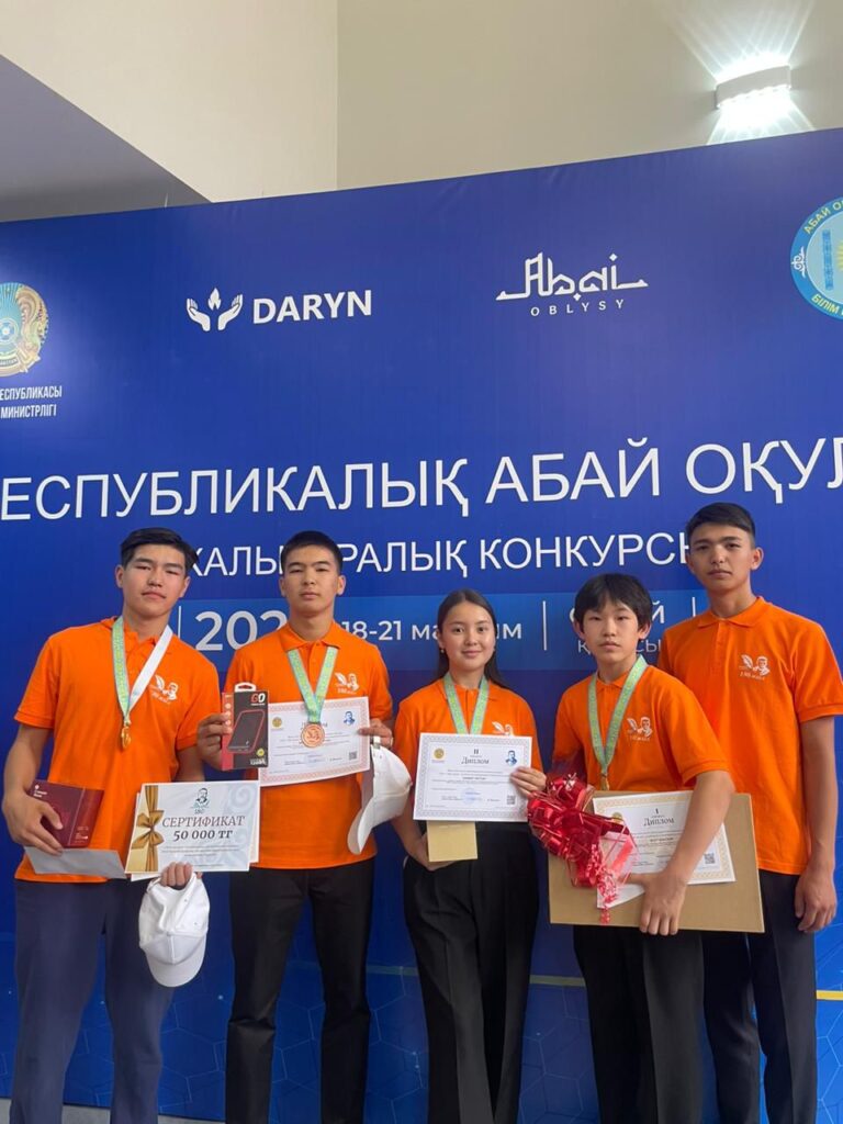 Республикалық байқау қорытындысы бойынша «Абайдың асыл мұрасы», «Әнді сүйсең менше сүй» бағыттарда Хумарбек Махсат (мұғалімі Тыныбеков Д.Ж.) және Әсет Альтаир (мұғалімі Мундуинова А.Е.) І дәрежелі дипломдарымен марапатталды; «Сөз өнеріндегі ұлы Абай бейнесі» бағытында Азамат Каусар (мұғалімі Болатбек Ш.) ІІ дәрежелі дипломмен марапатталды; «Өлеңге әркімнің-ақ бар таласы» бағытында Даулетқан Айсұлтан(мұғалімі Қуатбек Н.О.) ІІІ дәрежелі дипломға ие болды.