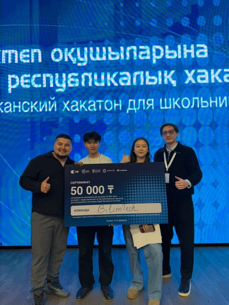 Республикалық хакатонның қорытындысы бойынша «Smart Technologies & Iot» номинациясында Павлодар қаласы А.Шәмкенов атындағы мектеп-лицейінің оқушысы Арғынова Назия І орынға және 150 000 теңгенің сертификатына ие болды; «Digital Business & Gov Tech» номинациясы бойынша дарынды балаларға арналған Абай атындағы гимназиясының оқушылары Альбекова Адина және Бағдат Әділбек ІІІ орынға иеленіп, 50 000 теңгенің сертификатына ие болды.