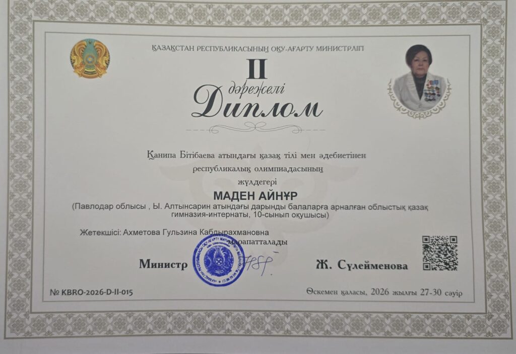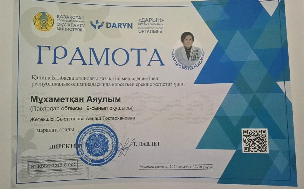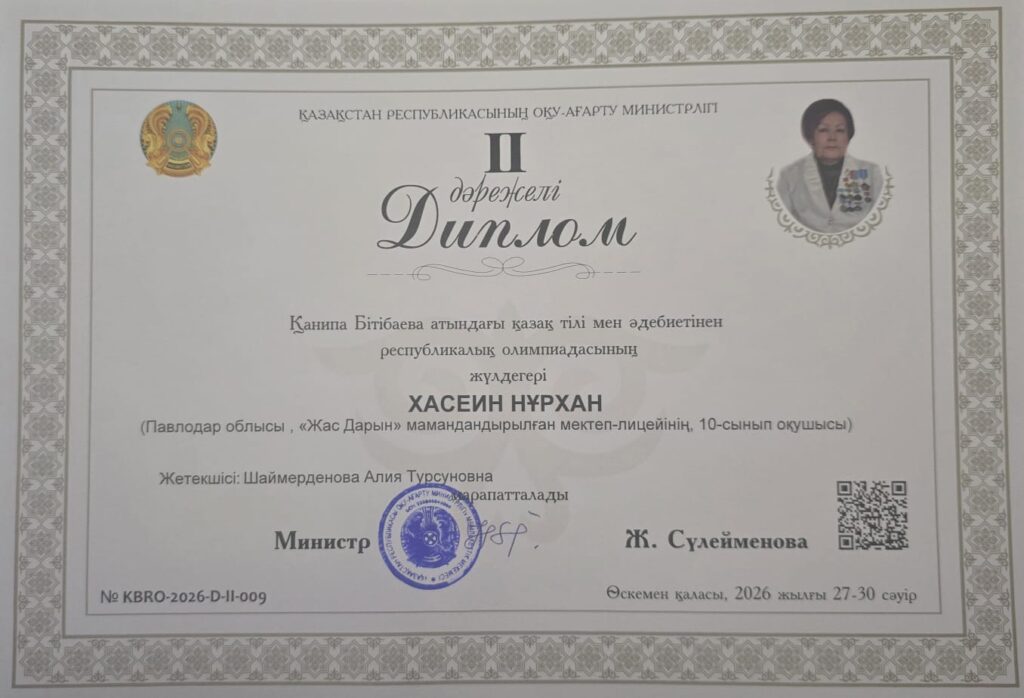 Қ.Бітібаева атындағы қазақ тілі мен әдебиеті пәнінен республикалық олимпиаданың қорытындысы бойынша ІІ дәрежелі дипломын «Жас Дарын» мамандандырылған мектеп-лицейінің 10 сынып оқушысы Хасеин Нұрхан (мұғалімі: Шаймерденова А. Т.) және Ы. Алтынсарин атындағы дарынды балаларға арналған облыстық қазақ гимназия-интернатының 10 сынып оқушысы Маден Айнұр (мұғалімі: Ахметова Г. К.) марапатталды.